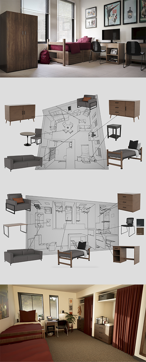 Each student will have an adjustable twin XL bed, desk with chair, chest of drawers, and closet space. We’ve selected furnishings with comfort and functionality in mind, allowing for multiple arrangement options to fit each student’s preferences and style. View full size images
